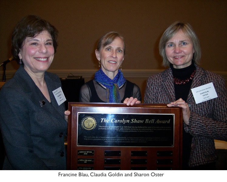 The Carolyn Shaw Bell Award was created in January 1998 as part of the 25th Anniversary celebration of the founding of CSWEP. Carolyn Shaw Bell, the Katharine Coman Chair Professor Emerita of Wellesley College, was the first Chair of CSWEP. (To read a short biography of Carolyn Shaw Bell, see our Winter 2005 Newsletter.) The Carolyn Shaw Bell Award (“Bell Award”) is given annually to an individual who has furthered the status of women in the economics profession, through example, achievements, increasing our understanding of how women can advance in the economics profession, or mentoring others.