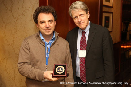 Ruben Durante and Stefano DellaVigna, recipients of the 2017 AEJ: Applied Economics Best Paper Award (not pictured: Brian Knight and Eliana La Ferrara)