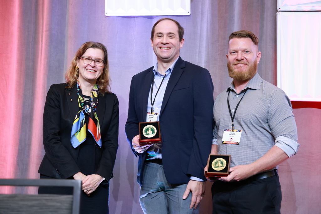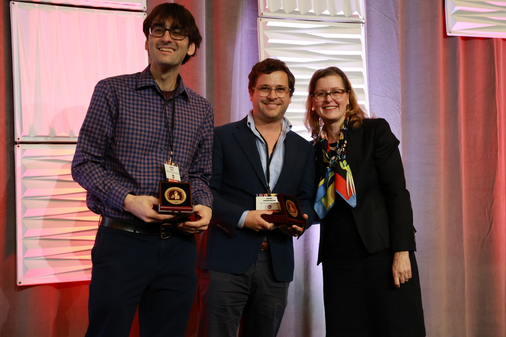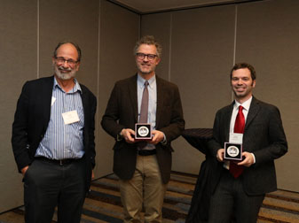 | Christopher Conlon (center) and Michael Sinkinson (R) receiving AEJ:Microeconomics Best Paper Awards (not pictured: Matthew Backus) | |