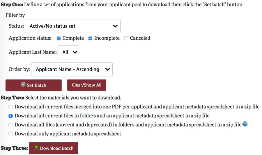 - All current files – will download a zip file with a folder for each candidate containing a manifest and that candidate’s application materials.