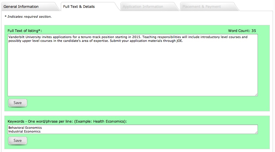 The second tab is for "Full-Text and Details" for your listing. There are three sections to complete in this tab (full-text and keyword; locations; and JEL classifications); when completed, each section will be shaded green.