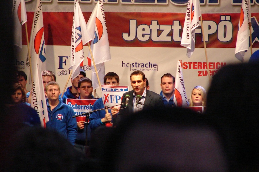 Heinz-Christian Strache gives a campaign for the Freedom Party of Austria.