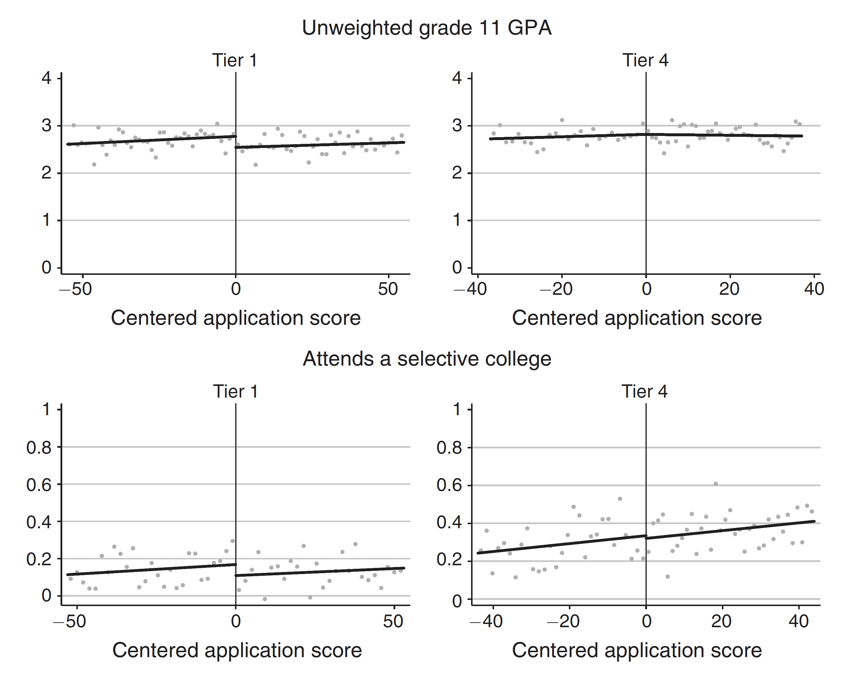The authors compared students just above and below admission cutoffs within these neighborhoods tiers. Their data included the enrollment records, test scores, and transcripts for over forty thousand students from 2010 to 2014.