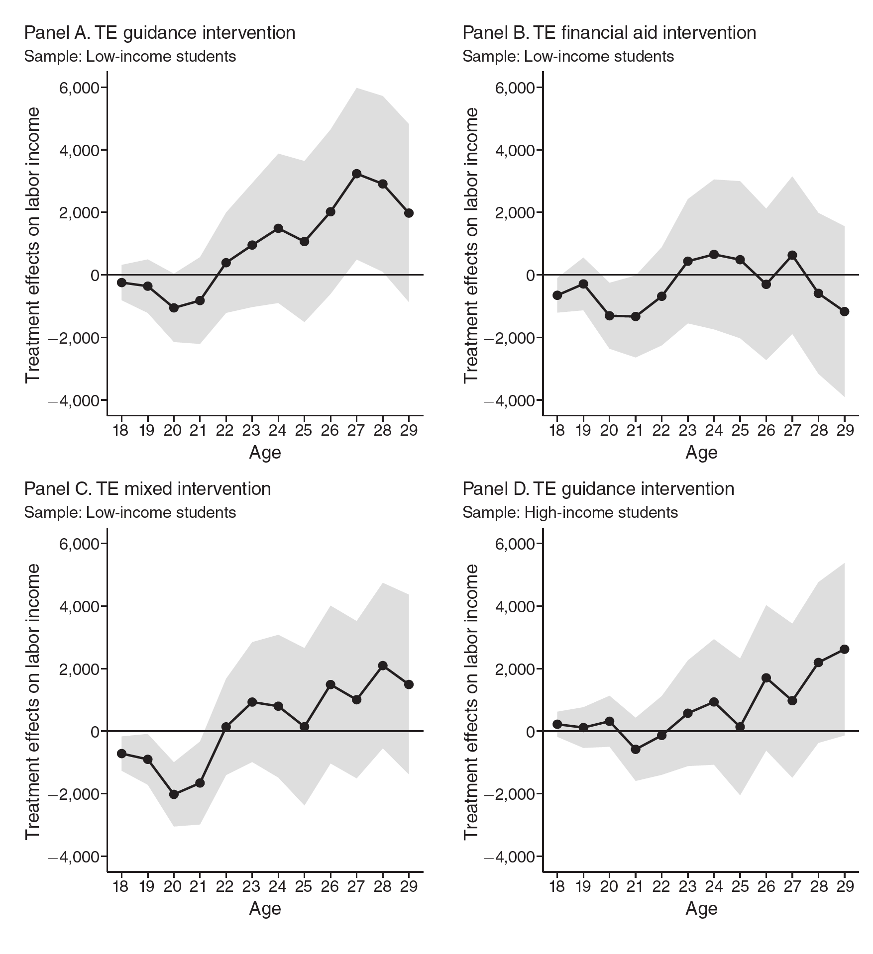 Panel A shows that the career guidance intervention had a significant impact on low-income students. While these students initially earned less than their peers during their college years, their earnings surged between ages 23 and 29, ultimately reaching approximately CA$2,700 in higher annual income by their late twenties—a 10 percent increase over the control group.