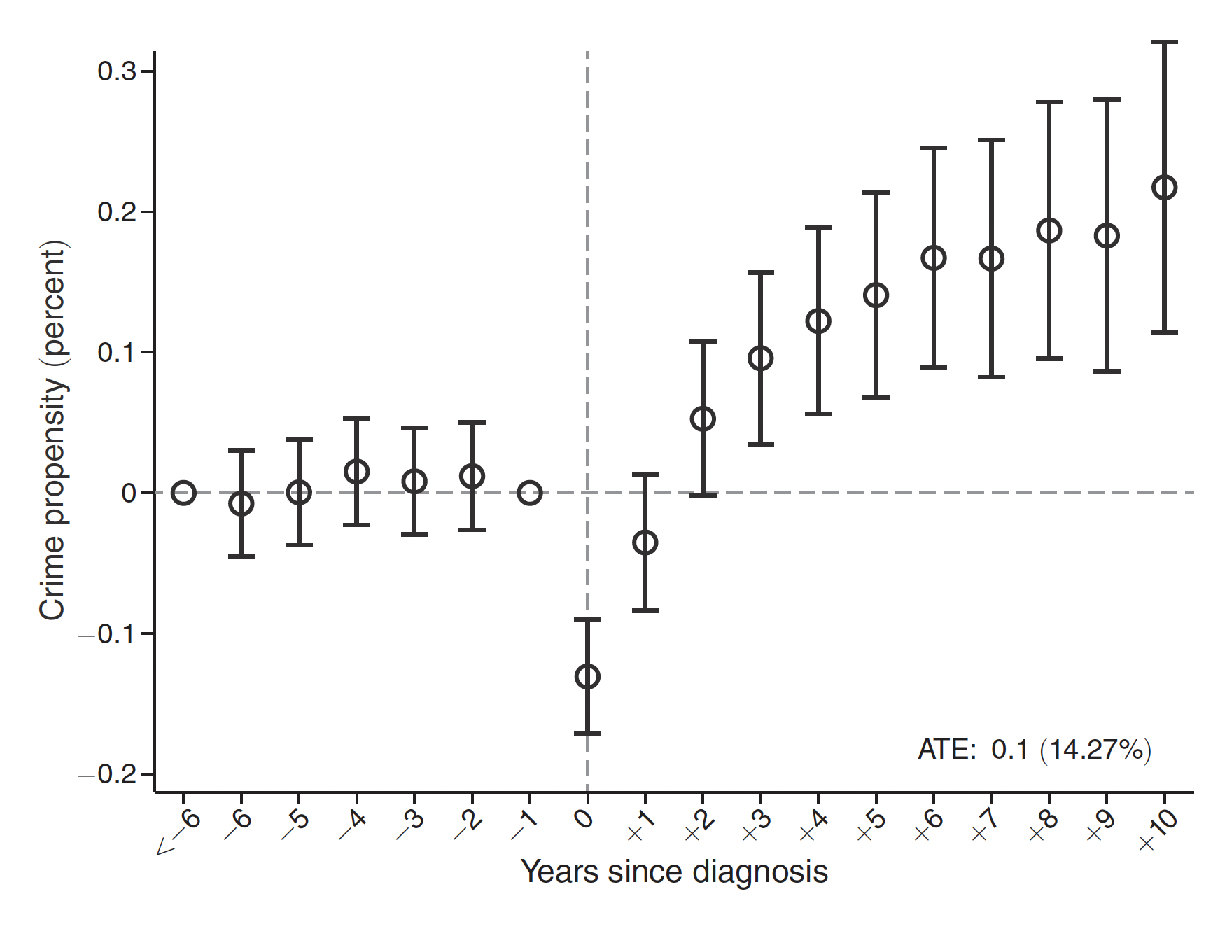 Overall, the average treatment effect of a cancer diagnosis amounted to a 0.10 percentage point higher likelihood of committing a crime, representing a 14 percent increase relative to the baseline annual crime rate of 0.69 percent.