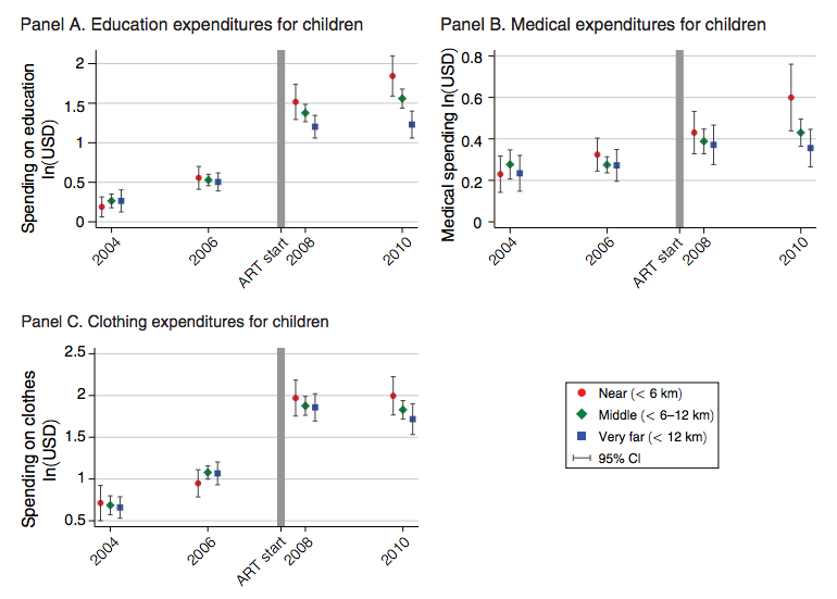 Figure 3 from their paper shows an increase in education and health care spending after the treatment was introduced, and the effects were more pronounced closer to a treatment facility. Spending on clothing barely changed at all, which is to be expected, as people are less likely to treat it as a long-term investment.
