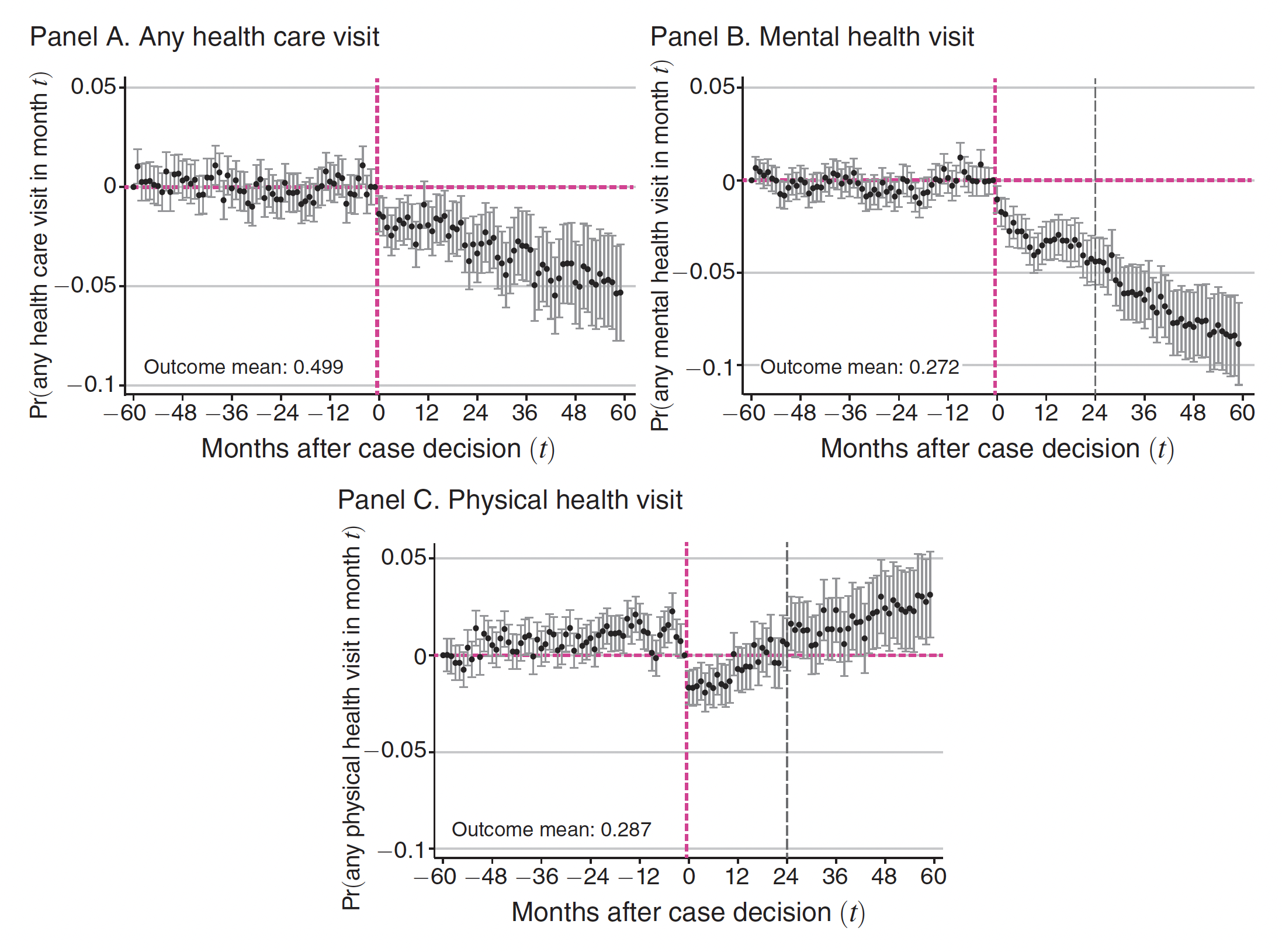Figure 1 from the authors’ paper tracks the probability of a health care visit five years before and after sentencing, indicated by the red dashed vertical line at zero.