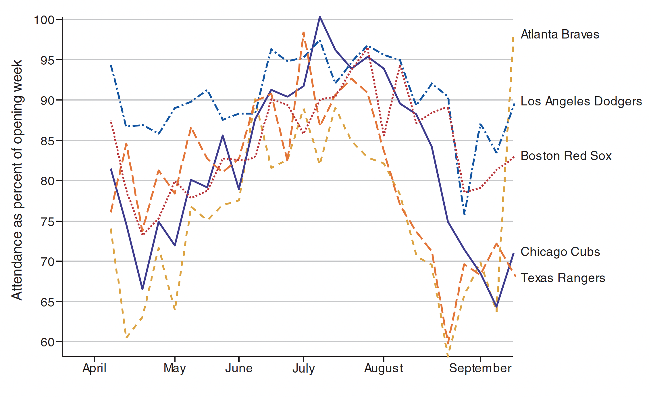 Figure 2 from the authors’ paper tracks baseball attendance throughout the season for five major teams: the Atlanta Braves, the Boston Red Sox, the Chicago Cubs, the Los Angeles Dodgers, and the Texas Rangers.
