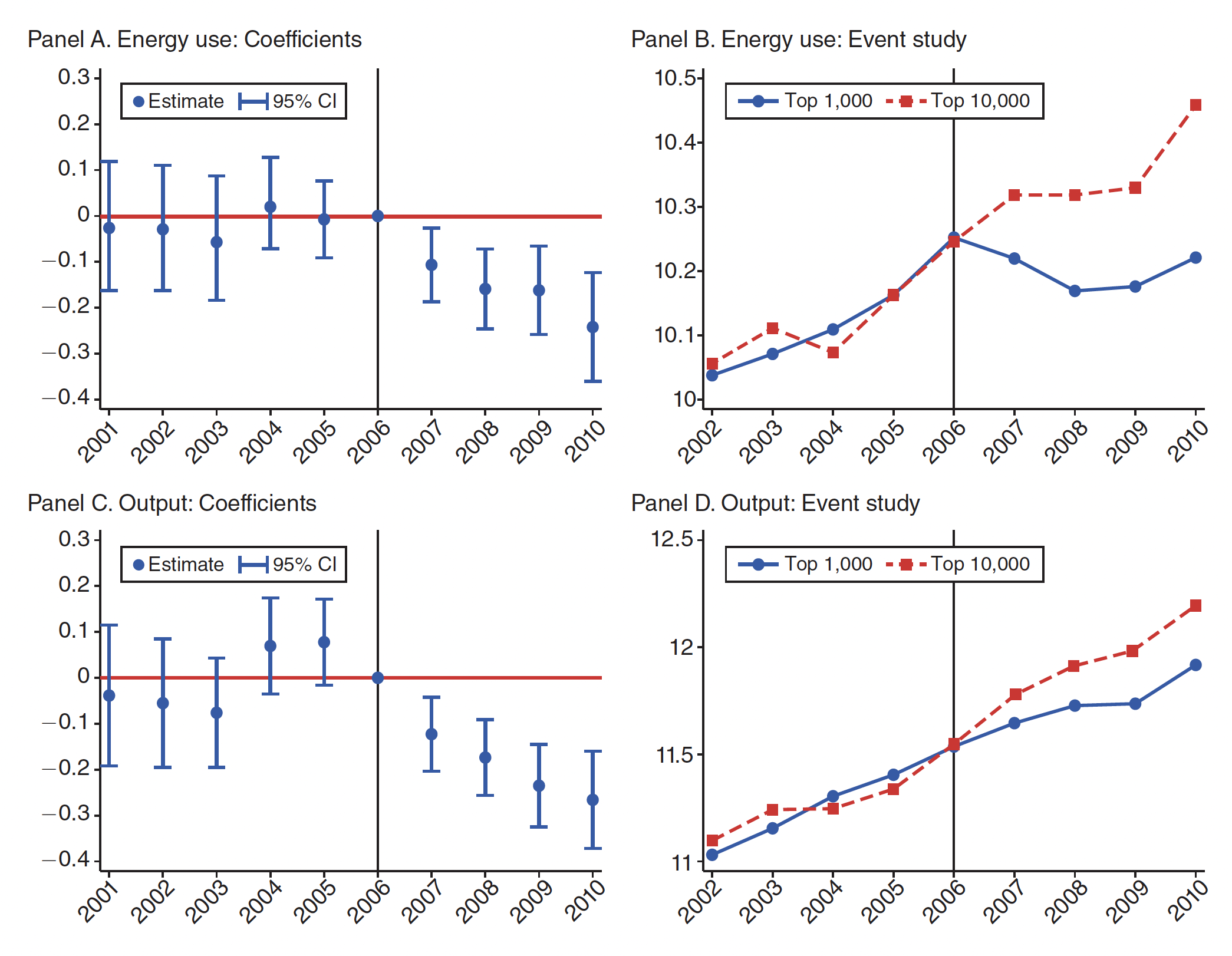 Panel A and Panel B show the logarithm of energy use by regulated firms (Top 1,000) and unregulated firms (Top 10,000) and the estimated differences between the two groups. (The blue vertical bars are 95 percent confidence intervals.) Before 2006, regulated and unregulated firms had similar patterns in their energy consumption. However, after the conservation program began, regulated firms decreased their energy use by roughly 13 to 16 percent relative to unregulated firms. This suggests the program was successful in its primary goal of reducing energy consumption at targeted firms.