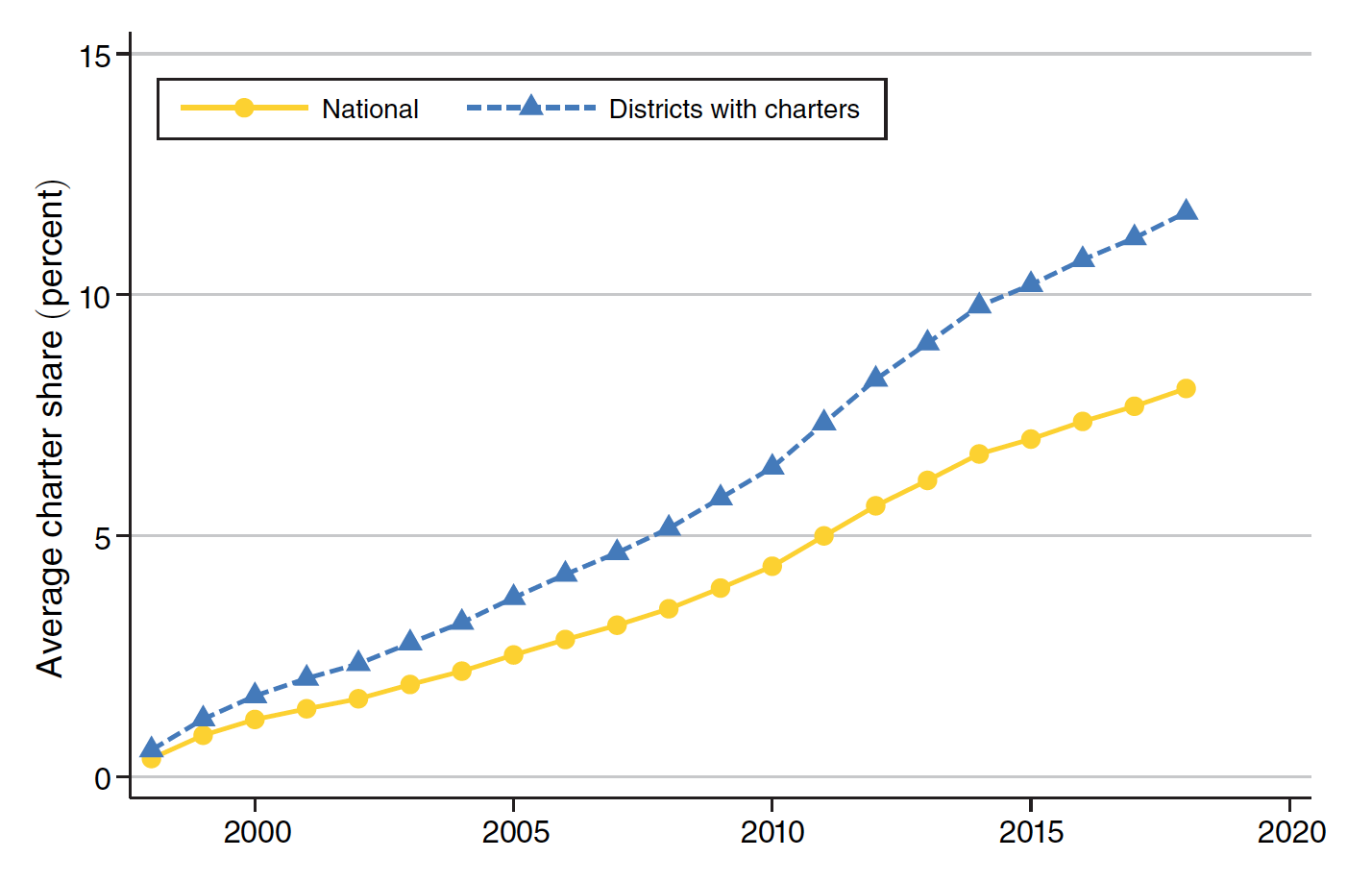 It’s important to note that charter schools remain a relatively small part of most school districts, accounting for on average about 7 percent of K–12 enrollment nationwide. The impacts may grow as charter schools become a larger part of individual school districts.