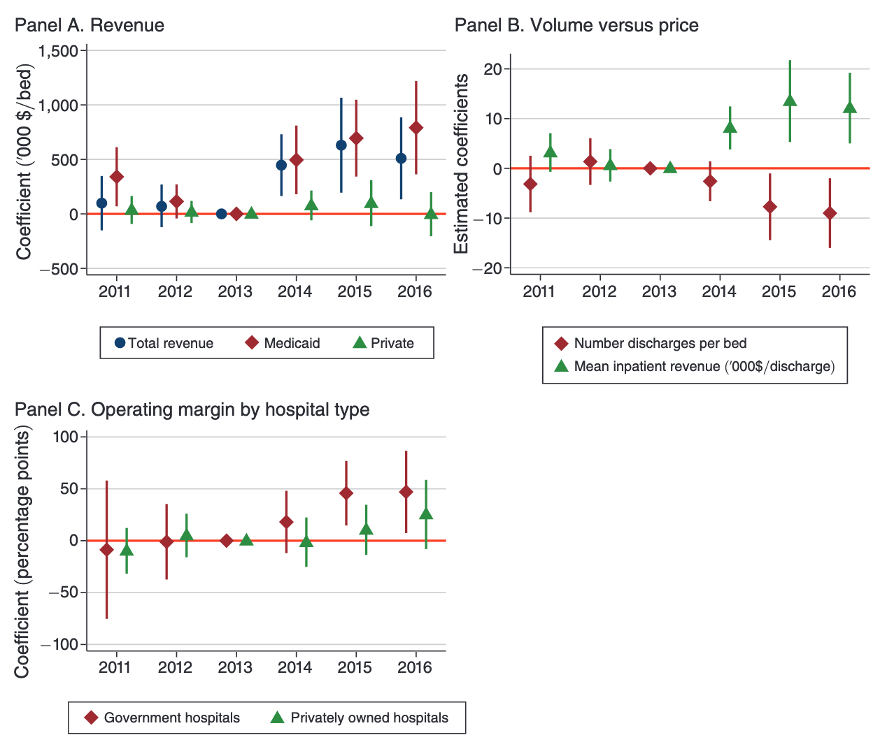 Finally, panel C looks at the impacts on the operating margin of government-run (red diamonds) and private hospitals (green triangles). Publicly owned hospitals stood to gain more from the Medicaid expansion because they served an outsized share of Medicaid patients. Both publicly and privately owned hospitals had boosts to their bottom lines from the ACA, although as expected the former experienced greater profitability.