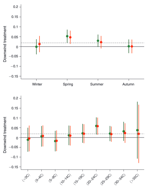 Figure 5 from their paper shows the effects during various seasons (panel A) and temperatures (panel B). It shows the change in the number of violent crimes within one mile of the downwind side of the interstate as a percent of the average number of crimes. The green dots control for day-to-day variation in crime near interstates and the red dots additionally control for different characteristics on either side of the highway. The horizontal dashed line represents the average effect (1.9 percent increase) on crime from being in a downwind area.