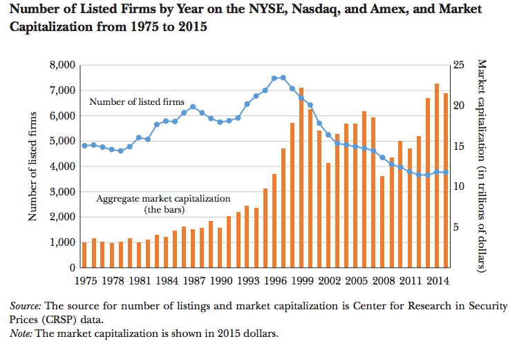 The chart above compares the number of listed firms on the New York Stock Exchange, Nasdaq, and Amex, to their market capitalization. In 1975, the US had 4,819 listed firms, the number increasing steadily until reaching its peak in 1997 at 7,507. After that, the number plummeted, hitting 3,766 listed firms in 2015. Meanwhile, their aggregate market capitalization grew, illustrating how much larger companies today have become.
