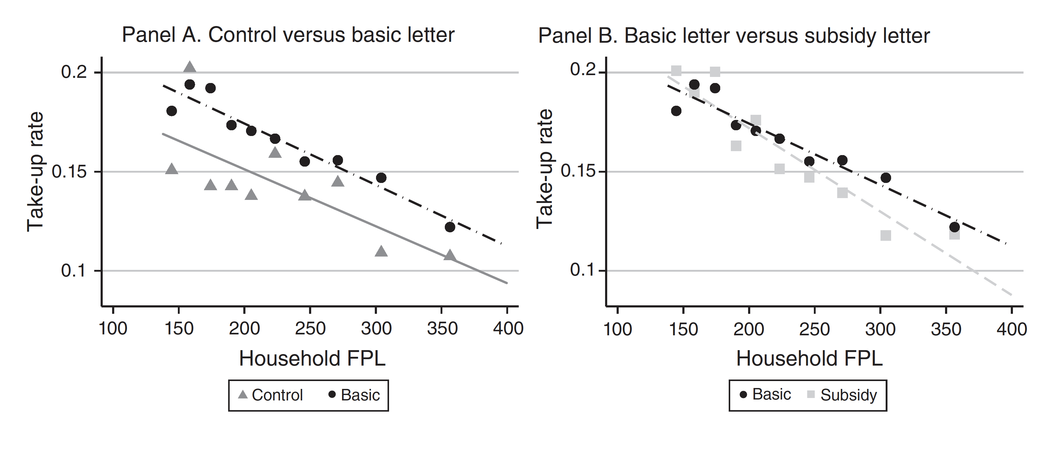 Figure 2 from their paper shows how the letters affected take-up rates by income as a share of the Federal Poverty Line (FPL).