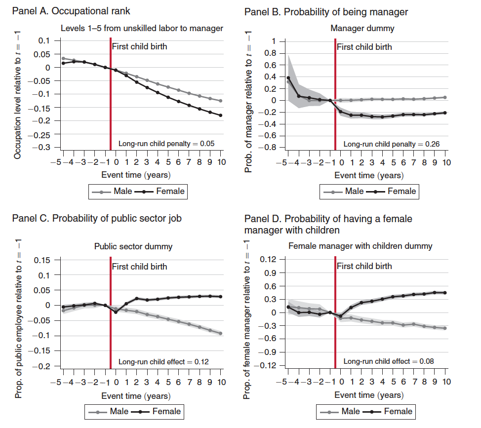 The figure above from their paper shows the impact that children have on the employment prospects for men and women over the long run. In each case, women are penalized more than men. Panel A looks at occupational rank—basically, how the birth of a child affects prospects for obtaining higher skilled jobs. Men and women were on the same track before becoming parents, but the two diverge after the first child comes along. Women are also less likely to become managers after their first child (Panel B), while men aren’t affected at all. Over the long run, the probability of rising to a manager level drops 26 percent for women compared to men.