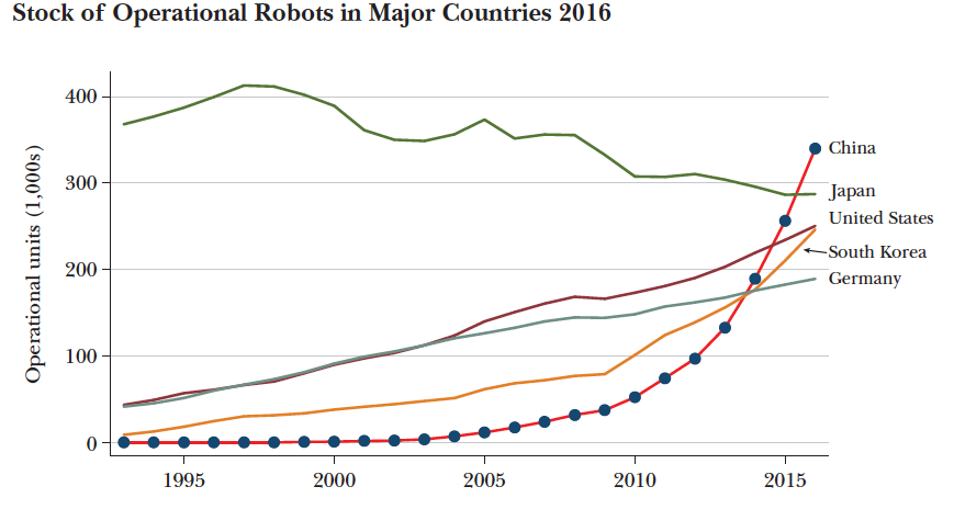 Figure 1 from their paper charts the dramatic ascendency of robots in China. It shows the top five robot markets in the world—China, Japan, the United States, South Korea, and Germany—which accounted for 72 percent of the world’s operational robot units in 2016. Once a dominant market for robotics in the late 1990s, Japan is the only one of the five to experience declining stock. Meanwhile, China has surged in the past decade and hit 339,970 operational units in 2016, accounting for 19 percent of the total worldwide.