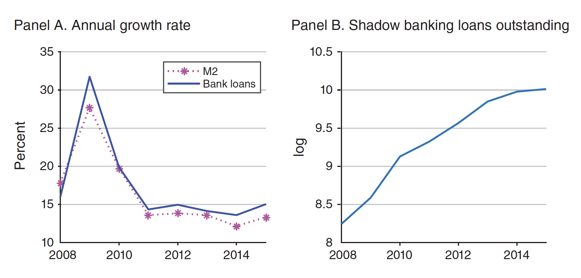 Panel A from Figure 1 in the paper shows the sharp growth in traditional credit (M2 and bank loans) that the central bank encouraged after the 2008 financial crisis. The drop that immediately follows shows that the central bank was successful in restricting traditional credit.
