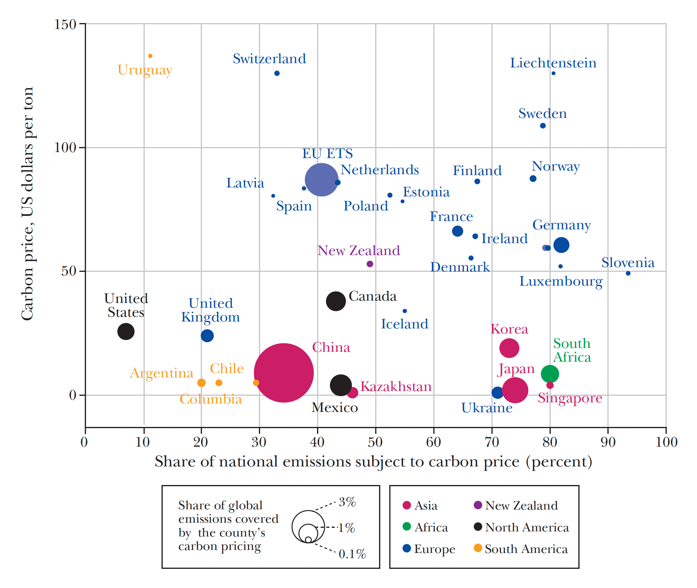 The x-axis indicates the share of carbon—or the carbon-equivalent of other greenhouse gasses—emitted in each jurisdiction. The y-axis indicates the carbon price per ton of CO2. The size of each circle is proportional to the share of global carbon emissions from that jurisdiction, and the colors indicate the continent where the emissions occurred.