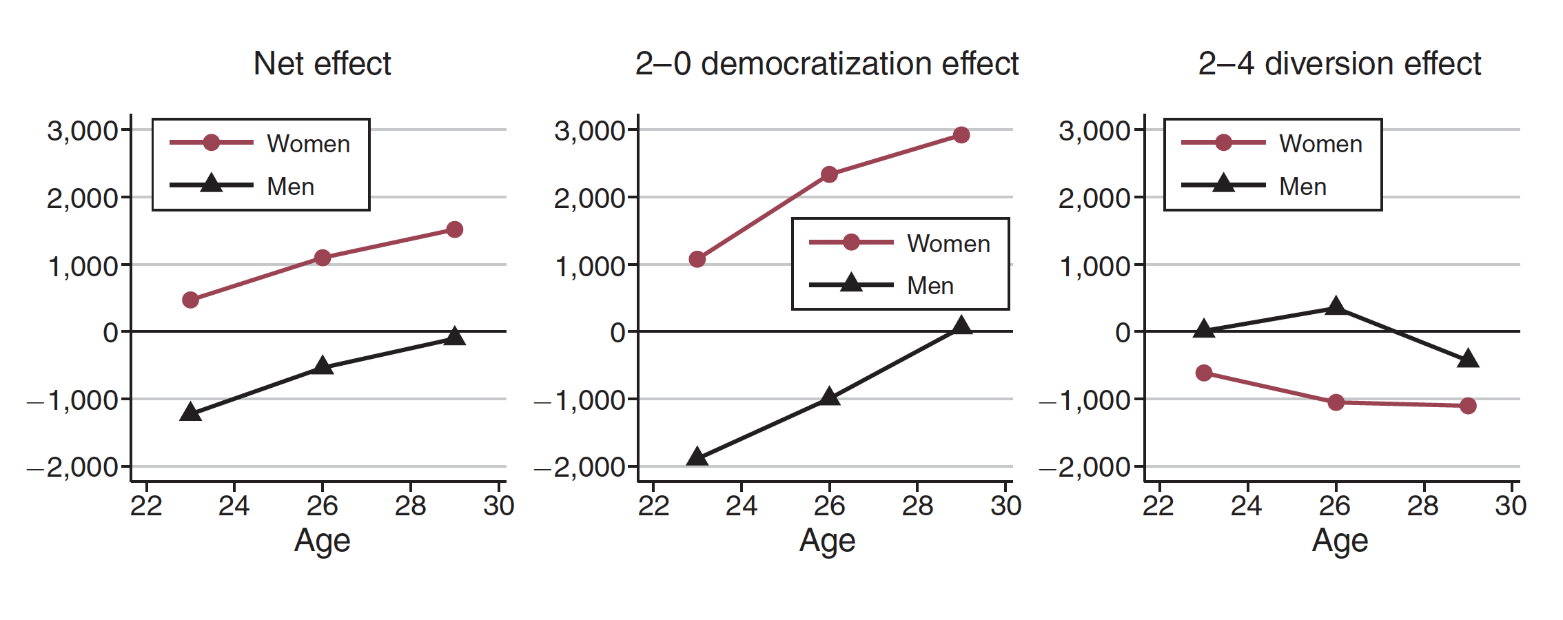 The right panel shows the earnings effects on those who were diverted from attending a four-year institution, revealing no strong trend. Although there is a nearly constant negative impact on the earnings of women in this group throughout their twenties, the significant gains for women who wouldn't have attended any college more than makes up for this and explains the positive net effect.