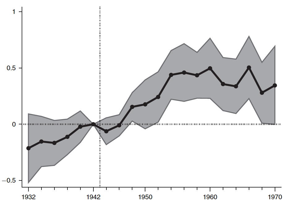 Figure 4 from their paper combines those two strategies into a triple differences model that compares the differential change in citations to BRP books from English-language and other-language authors with the same change for Swiss books. The solid black line shows the effects before and after the program began (indicated by the vertical dotted line). The shaded areas are 95 percent confidence intervals.