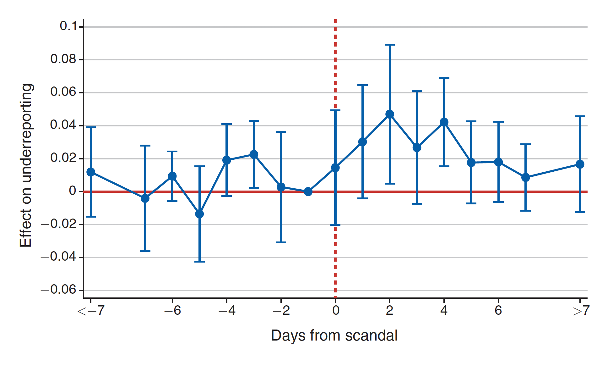 There is no difference in underreporting between cities before a scandal breaks, but there is a significant uptick in underreporting during the four days immediately after a local public scandal. After four days, underreporting returns to normal levels.
