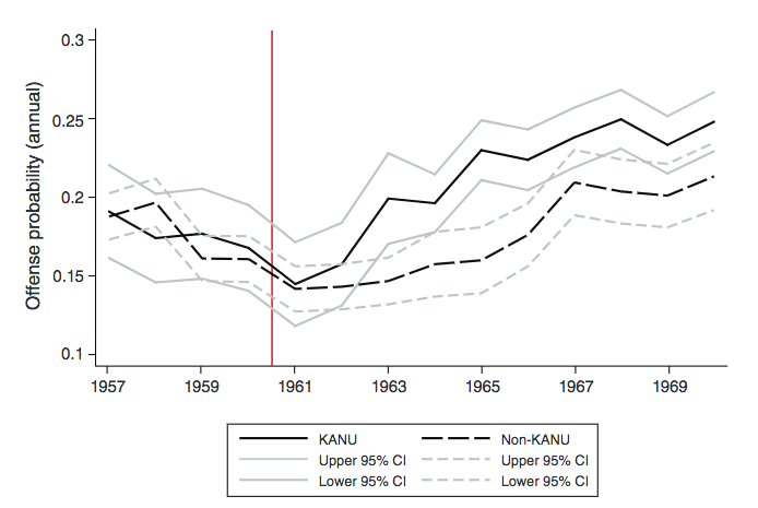The figure above shows that police officers were more likely to commit offenses following the first multiparty elections in 1961, which sparked the rise of ethnic politics in Kenya. Officers from ethnic groups that were represented by the dominant Kenya African National Union, or KANU, behaved the worst.