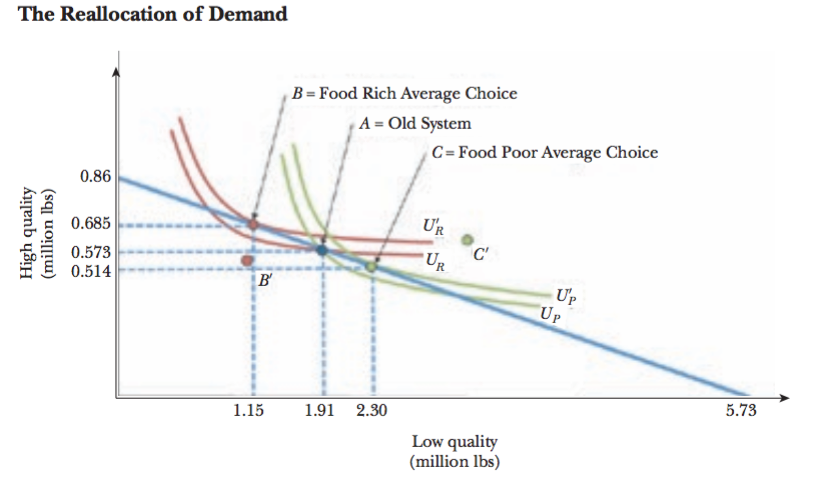 Under the new system, banks that already had a lot of low-quality staples and who wanted more expensive items (dubbed “food rich” in the chart and labeled point “B”) purchased 685,000 pounds of high quality goods and 1.15 million low quality. Those that shopped for quantity (“food poor”) purchased 514,000 pounds of high-quality and 2.3 million pounds of low-quality.