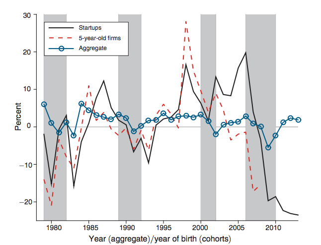 The chart above compares total employment levels for cohorts of startups, 5-year old firms, and the aggregate employment growth rate. (The time series for 5-year-old firms was shifted back to the year of their birth.) The shaded areas are periods in recession.