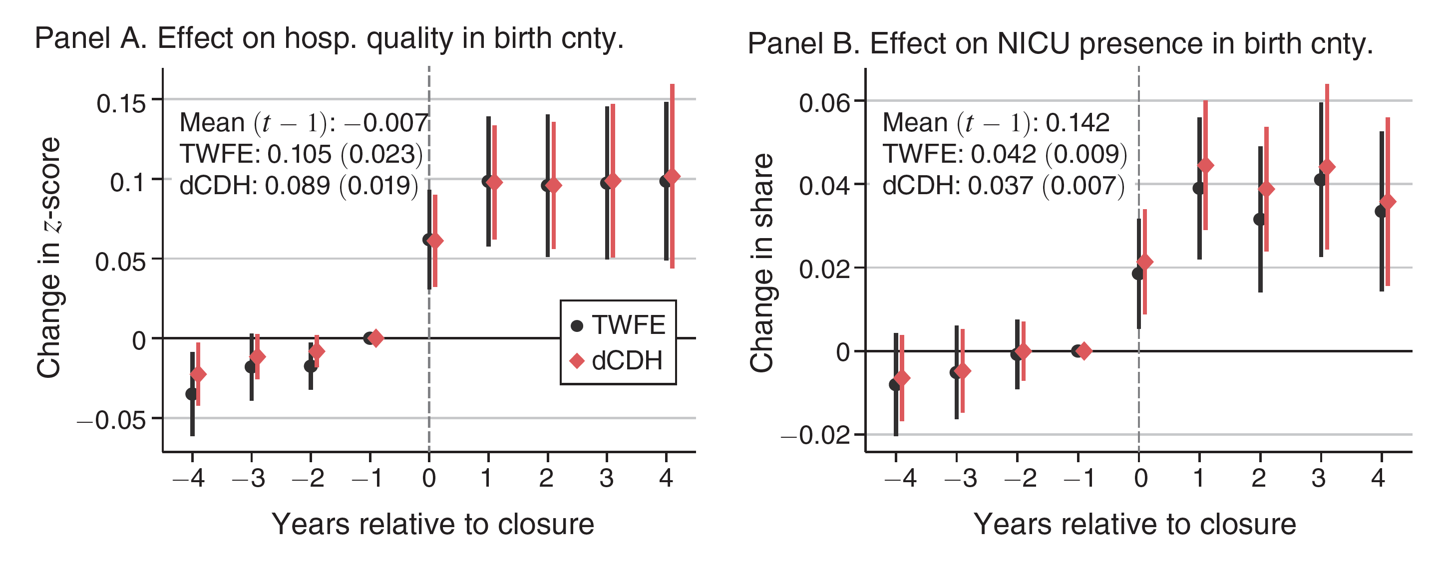Panel A shows the change in the z-score—the number of standard deviations from the average—of a composite measure of hospital quality. It shows that closures led women to give birth in counties with quality scores 0.1 standard deviations higher than their counterparts. Panel B shows the change in the share of births that occurred in counties with a neonatal intensive care unit (NICU)—an indicator of a hospital's obstetric resources. The chart shows that mothers in counties that experienced a closure were 4 percentage points more likely to give birth in a county with a NICU.