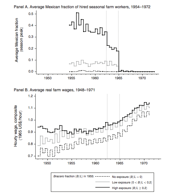 The figure above shows the Mexican fraction of hired seasonal farm labor in three groups of states: those with high exposure to Mexican workers (such as California and Texas), those with low exposure (Colorado, Minnesota, Oregon, etc.), and those with no exposure (Connecticut, Maryland, Pennsylvania).