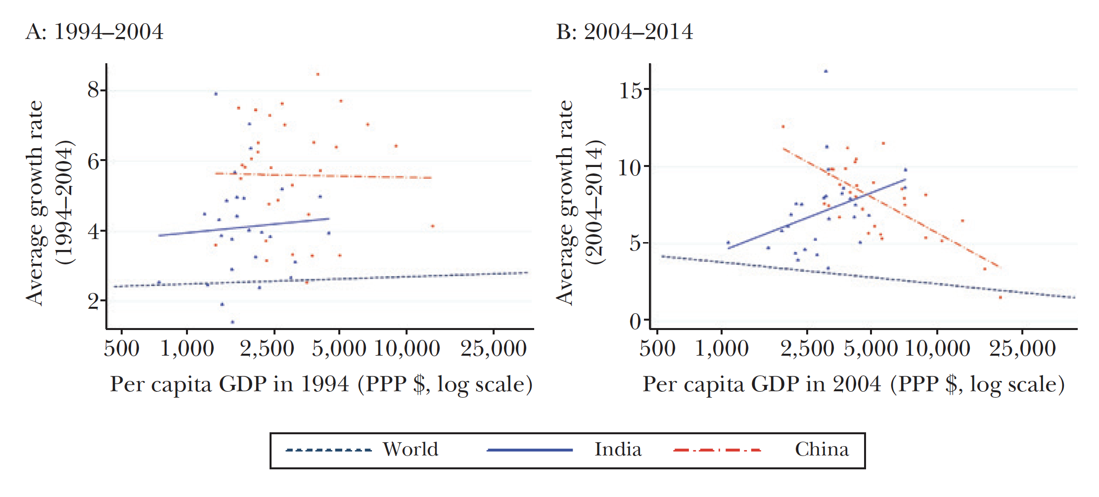 In the second period, Panel B, Chinese provinces and countries around the world start converging (the two downward-sloping dashed lines), but states in India now start diverging even more rapidly.