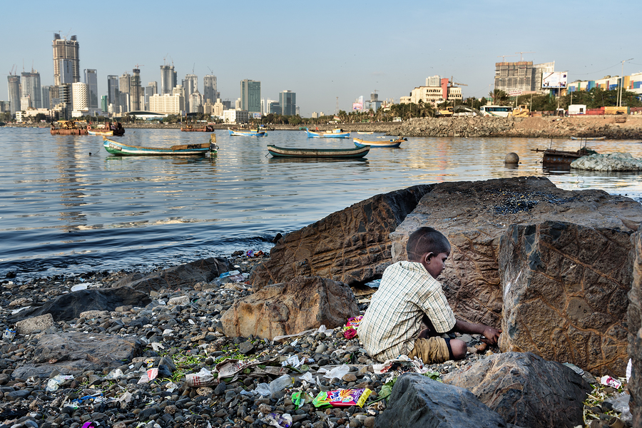 An Indian boy sits on a trash-strewn beach, with the Mumbai skyline in the background.