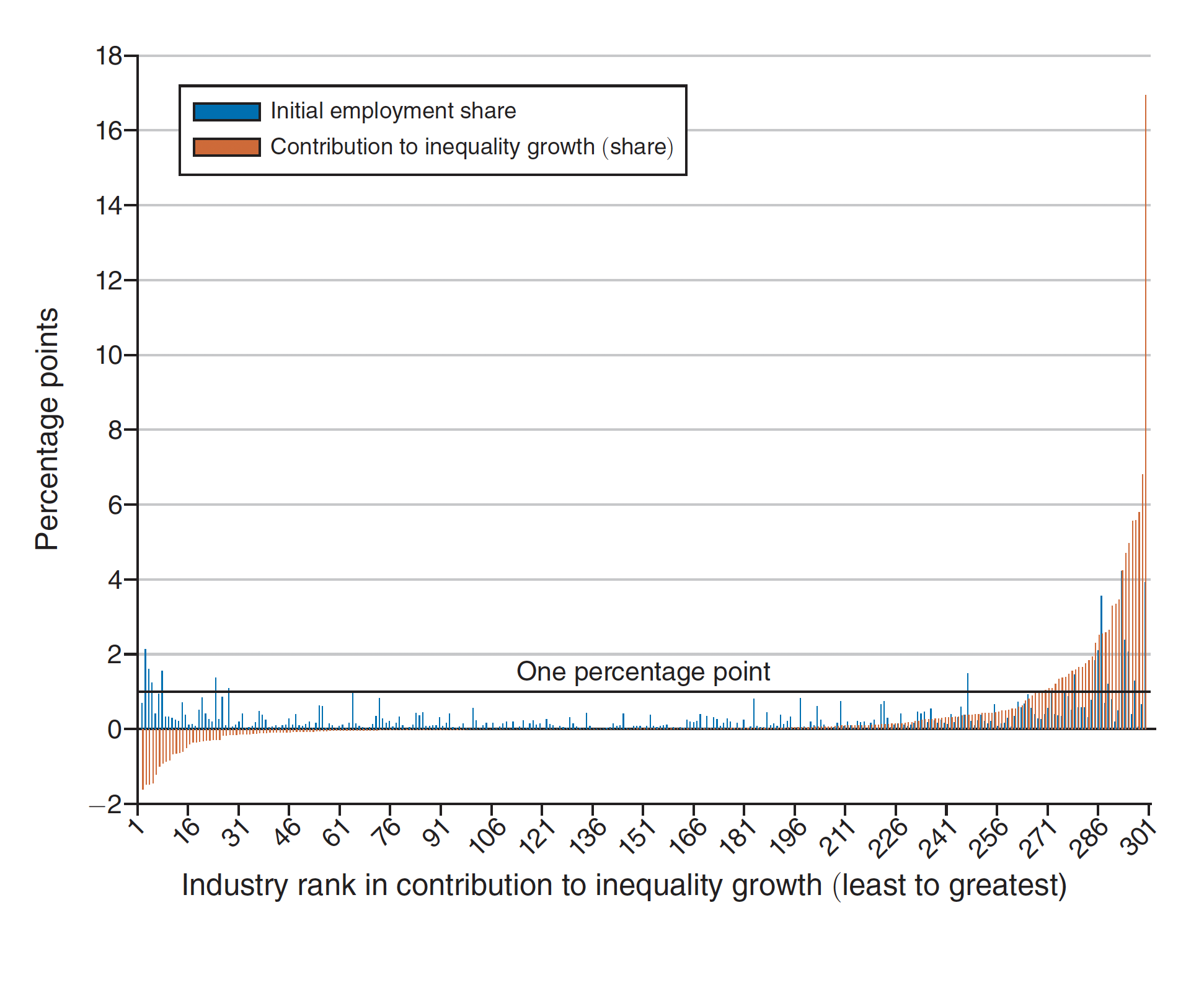 The chart shows the percentage of total employment in each industry in 1996 (blue bars), and how much each industry contributed to the growth in wage gaps over the period of study (orange bars).