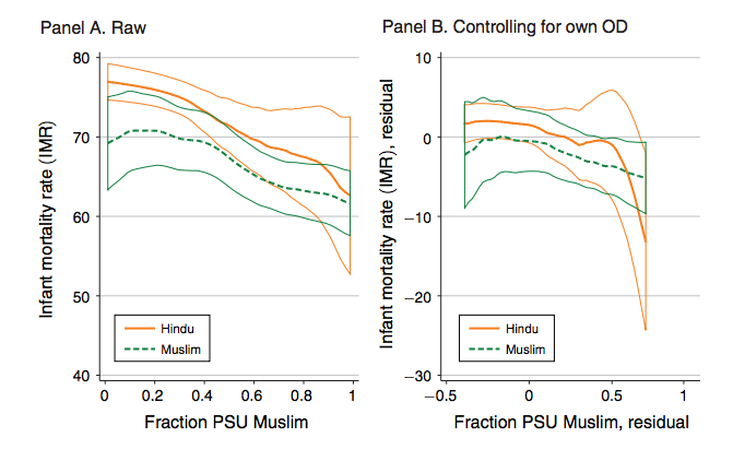 They find two interesting facts that may help explain the difference in mortality rates. First, Muslim infants typically live in neighborhoods where a larger share of their neighbors are Muslim. And second, both Hindu and Muslim infants are more likely to survive in neighborhoods with high shares of Muslim neighbors.