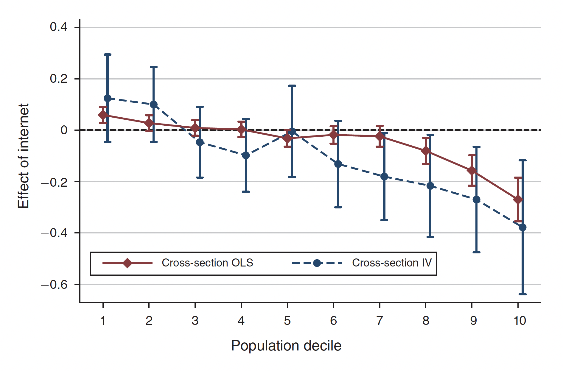 The chart shows the effect of a one standard deviation increase in internet penetration (y-axis) for each municipal population decile (x-axis) in states with local sales taxes. The red line with diamonds represents the effects using a standard regression approach known as ordinary least squares, which assumes that internet penetration is exogenous. And as extra support for that pattern, the blue line with solid circles represents a robustness check using an instrumental variables approach, which addresses the possibility that internet penetration is endogenous. The vertical bars are 95 percent confidence intervals.