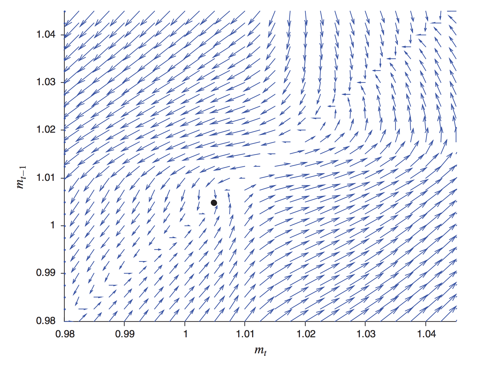 Figure 6 illustrates how investor optimism evolves given two pieces of information: the investor’s current belief about an asset’s price and her belief before that. If you follow the arrows, you will eventually land on the black dot, which represents the true price.