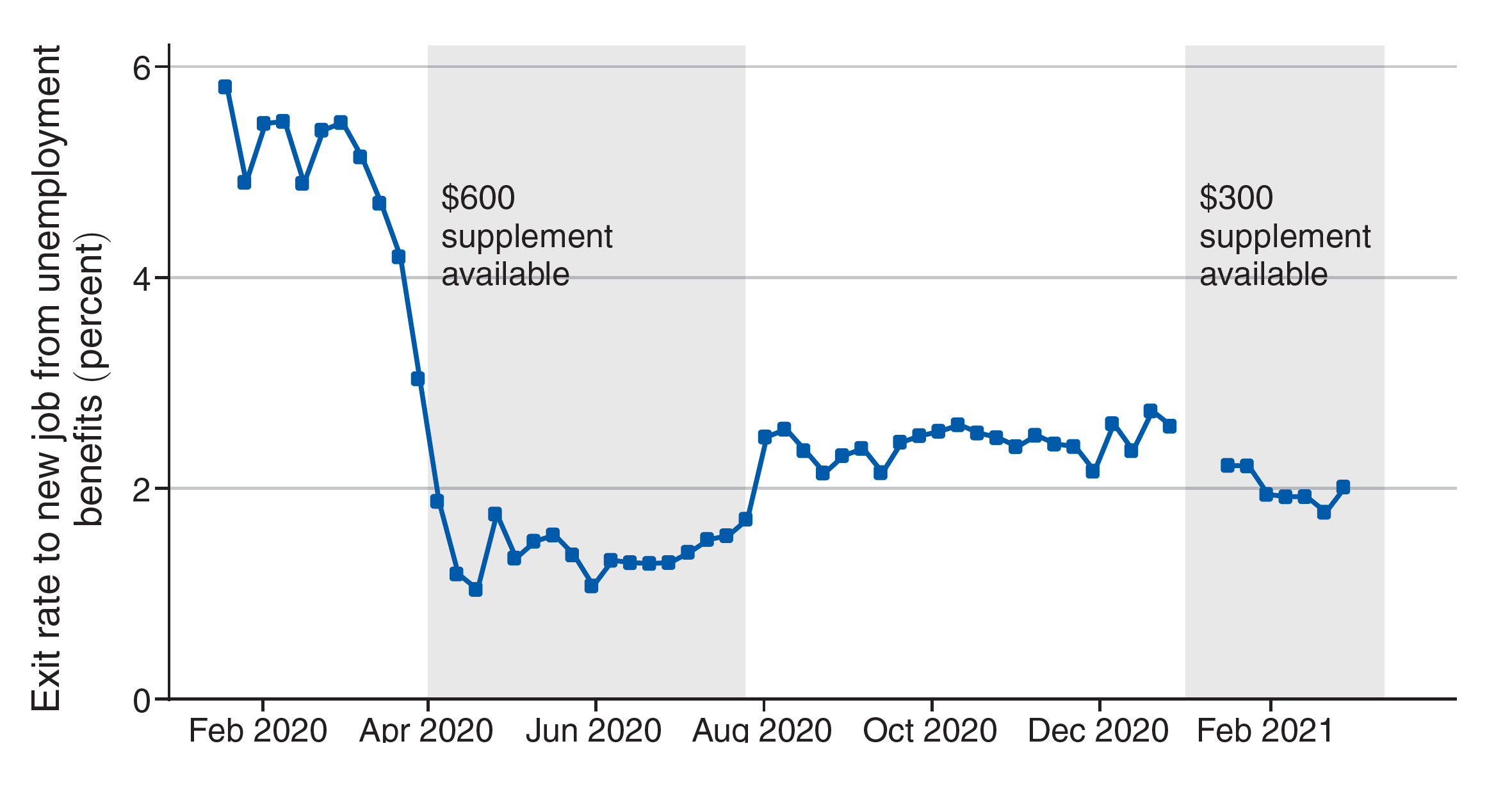 The blue squares represent the weekly exit rates from unemployment benefits to new jobs, as seen in data from 44 million households with a checking account at JPMorgan Chase. The gray shaded regions indicate when the expanded UI benefits were available.