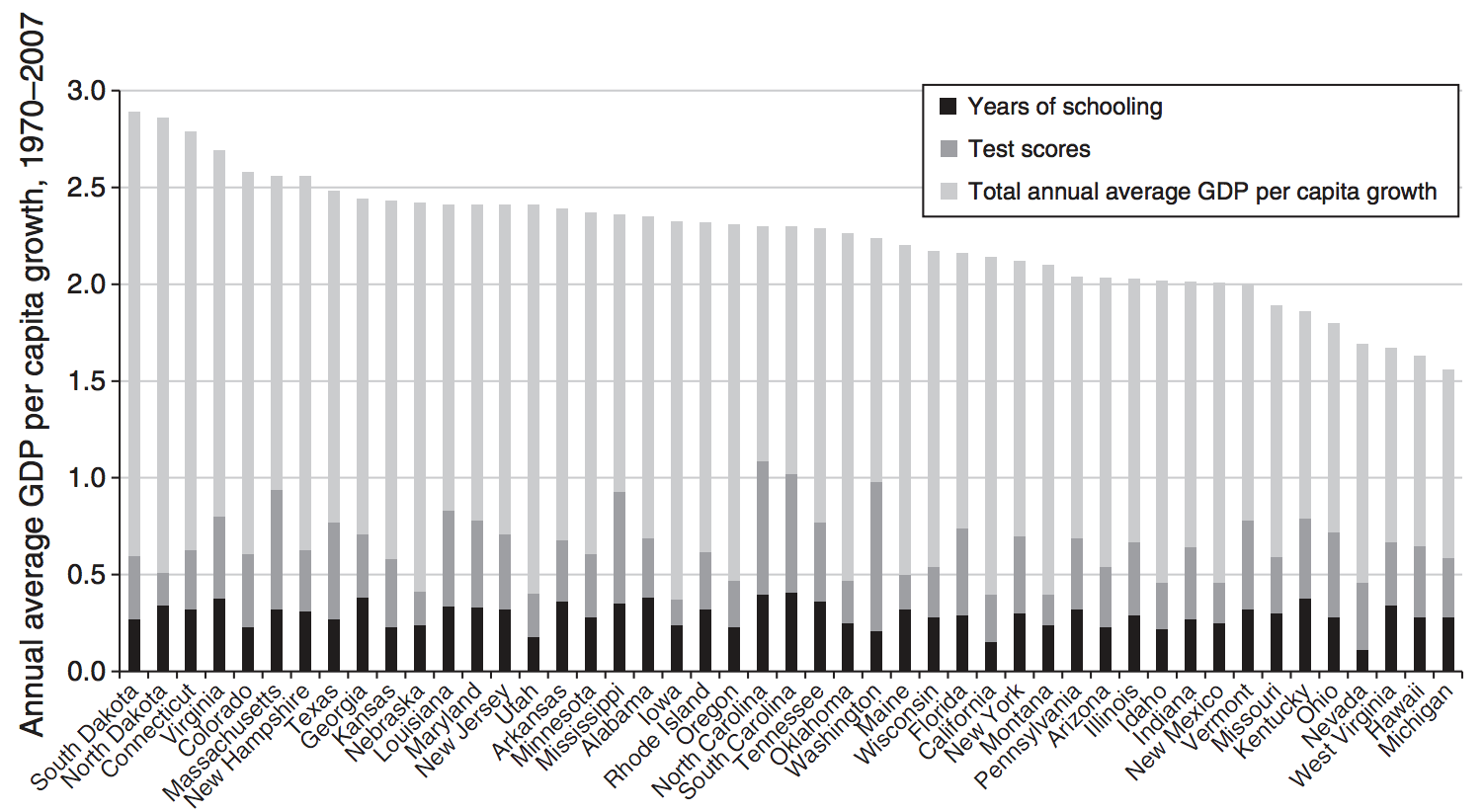 Still, the effects of knowledge capital differ from state to state. For example, test scores are not a large factor for Iowa, but they do explain much of Massachusetts’ growth. The figure below shows how much growth in state GDP per capita is attributable to citizens’ years of schooling and test scores.