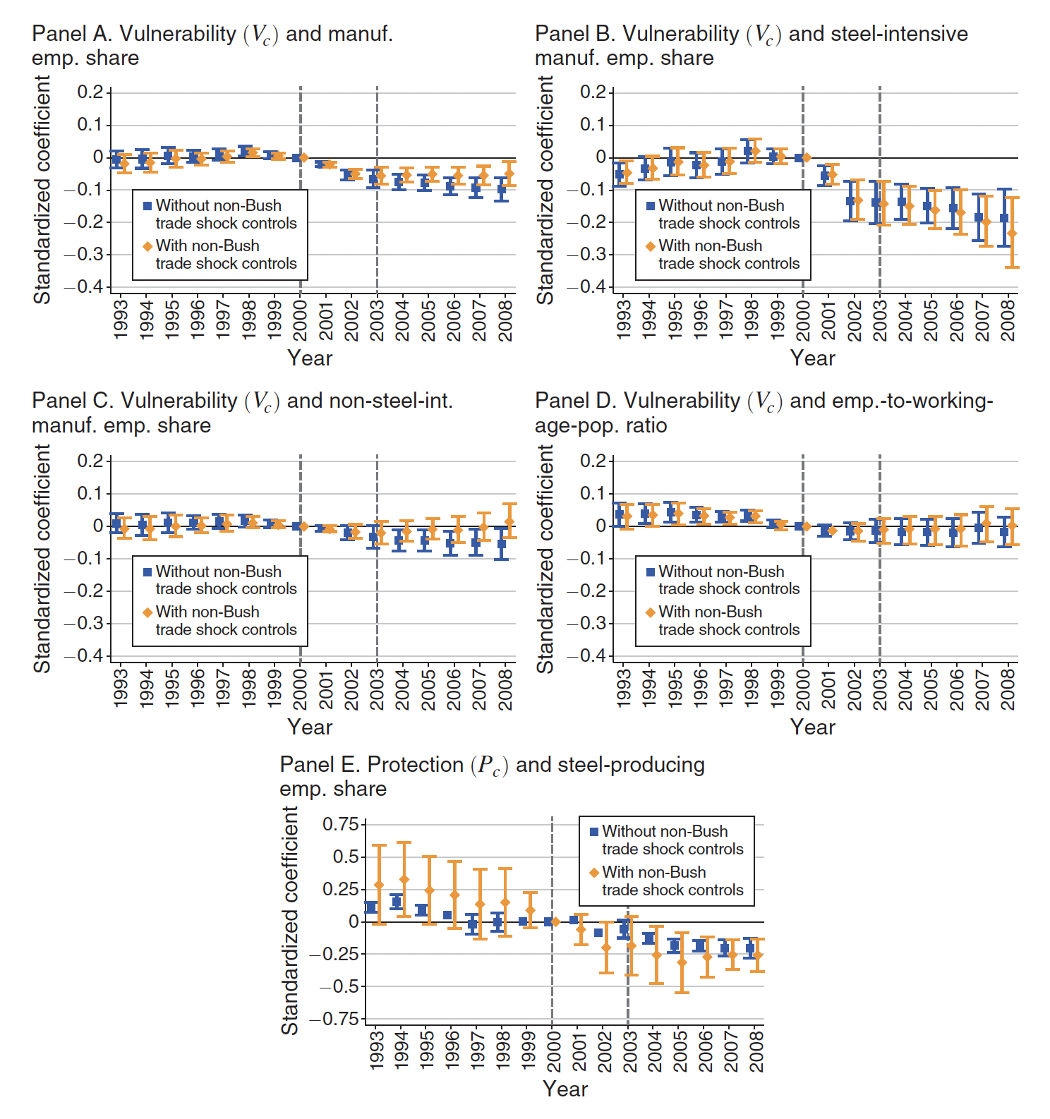 Figure 4 presents the authors’ main estimates for five different labor market outcomes over time. Each panel displays results with and without controls for Chinese import competition and steel antidumping duties. The vertical lines mark critical junctures—2000 was the last year before the Bush steel tariff process began, and 2003 marks the removal of the tariffs following a World Trade Organization ruling against their legality.