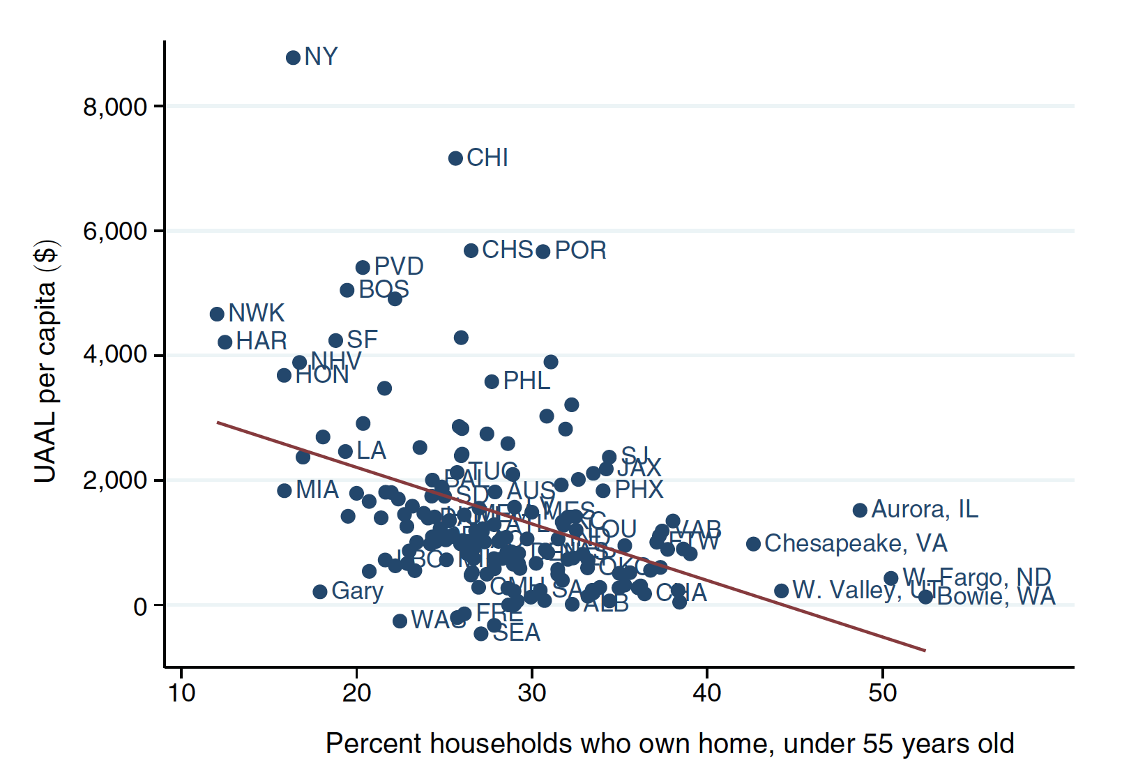 Their chart shows that as the portion of older homeowners increases in a city (towards the left of the chart), the more likely the municipal government relies on unfunded promises to retirees (towards the top of the chart).