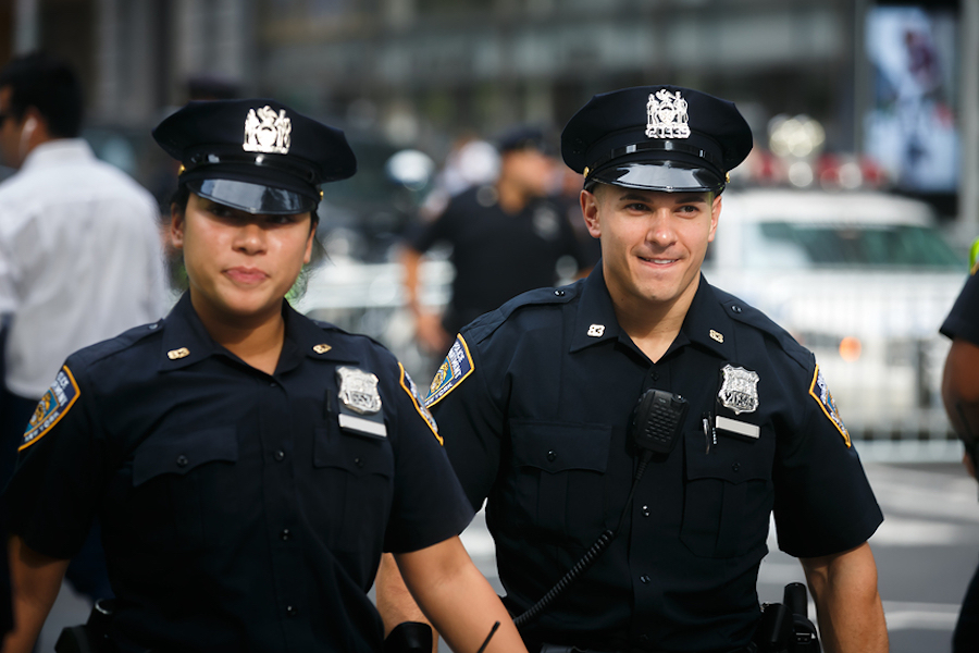 Police officers performing their duties on the streets of Manhattan. New York City has one of the largest unfunded pension liabilities of any city in the US.