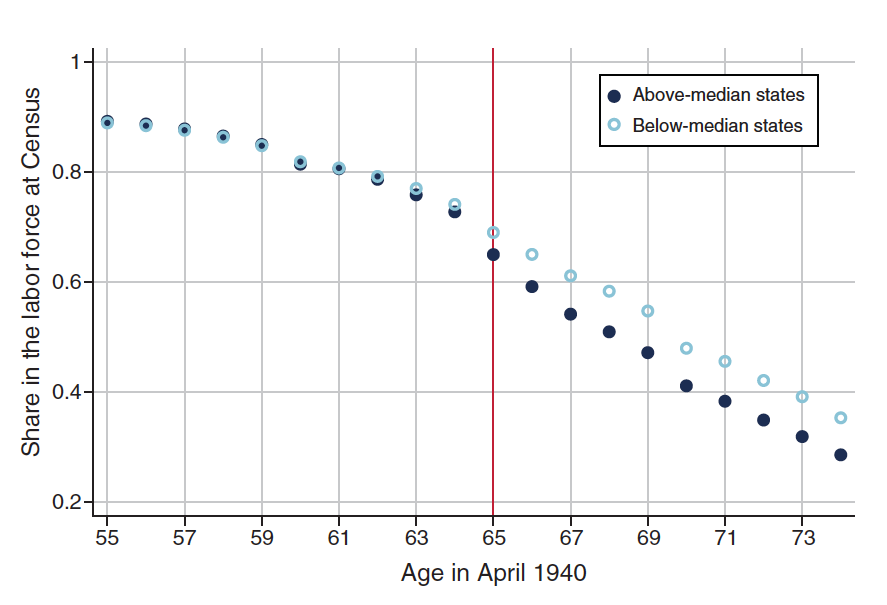 The authors estimated that OAA significantly reduced labor force participation among older people. Figure 2 from their paper plots the male labor force participation by age, separately for states with above- and below-median OAA payments per person 65 and older. The pattern of labor force participation is virtually identical in both sets of states until the workers reach age 65, after which there is sharp divergence.