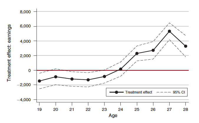Figure 2 from their paper shows the impact that the program had on earnings for young adults. Eligibility initially lowers earnings for young adults between the ages of 19 and 23. A 19-year-old who went through the program earns about $1,470 less per year, partly because they are more likely to attend college and not able to work full time like their peers who aren't attending college. But that changes around the age of 24, and by 28 years old, participants earned 19 percent more than the average 28-year-old in their cohort.
