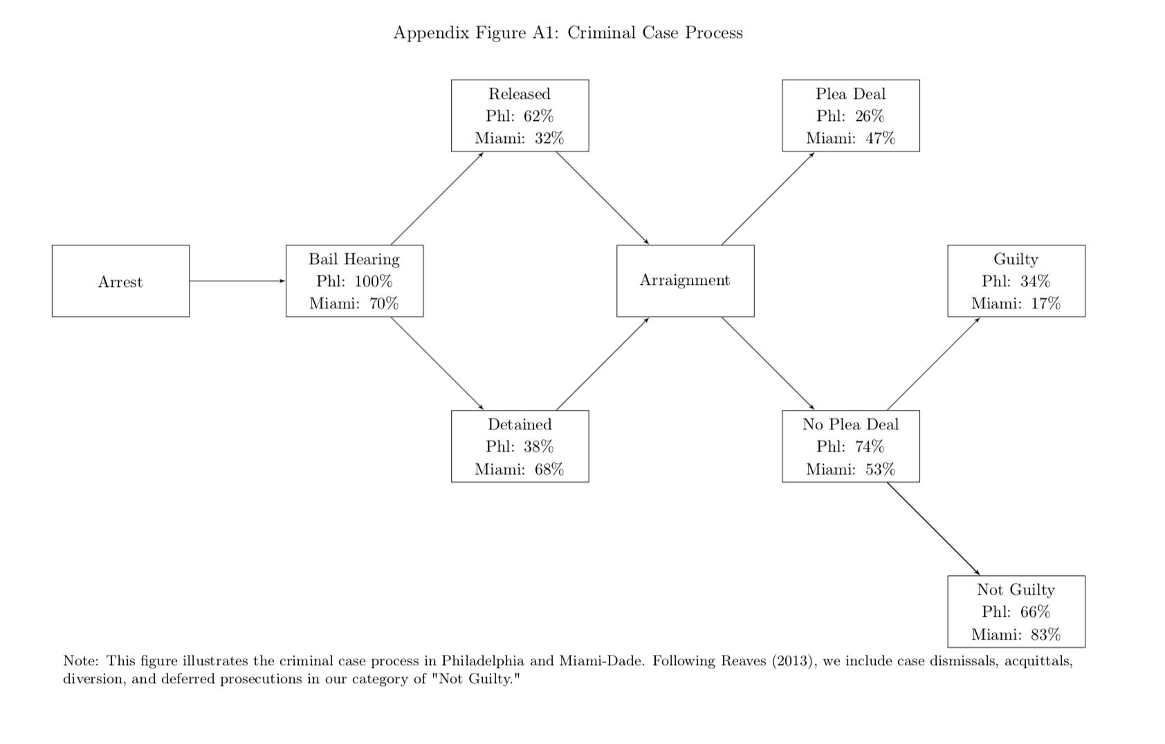 The figure above illustrates the path that criminal defendants followed in each city, with the share of defendants who ultimately are detained, reach plea deals, and found guilty. More than a third of defendants in Philadelphia are detained while two-thirds in Miami are jailed before trial.