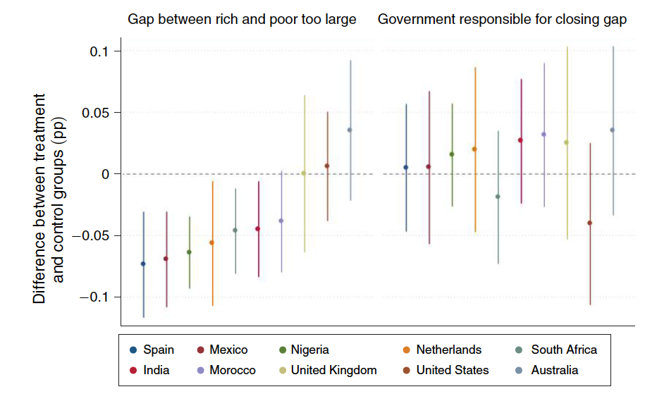Figure 8 from the paper shows the difference between the treatment and control groups of people in the poorest two quintiles of their nation’s income distribution. The colored dots represent the effects in individual countries (with 95 percent confidence intervals). The left panel shows how people responded to the income gap question and the right panel shows their opinion on whether the government should be responsible for closing the gap.