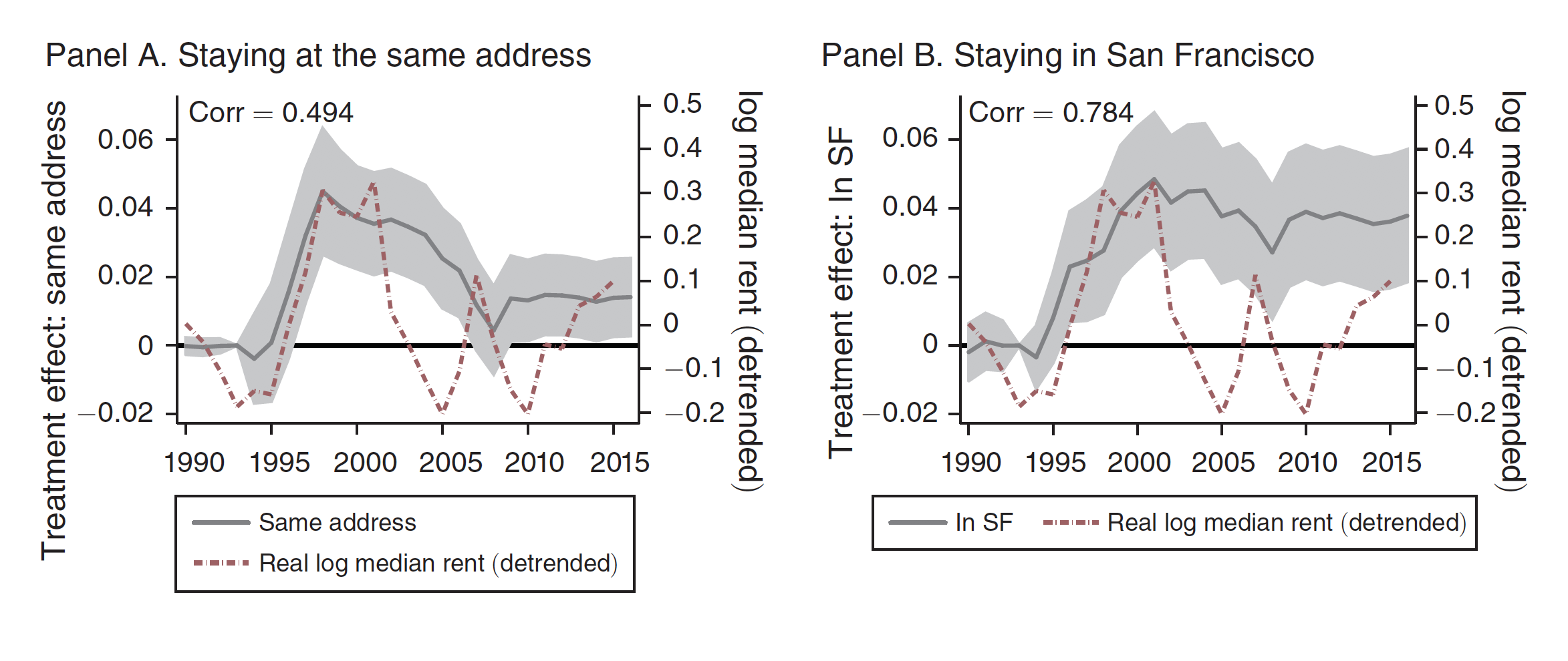In both panels, the dashed red line shows the yearly deviation from the trend in median rental rates. The grey line in Panel A represents the likelihood that someone in a rent-controlled unit stayed in their 1993 address compared to someone whose home wasn’t regulated. Panel B is the same, except that it shows the likelihood a tenant stayed in San Francisco. (The shaded areas are 90 percent confidence intervals.)