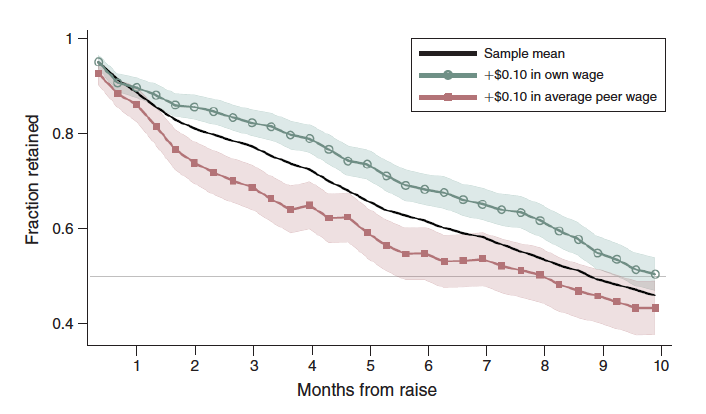 After roughly 30 days, a much larger share of those earning 10 cents less on the pay scale began to leave, a gap that continued for the rest of the period. The authors determined that a 10-cent increase in a worker’s wage boosted their tenure by about a month, while a 10-cent raise in a coworker’s wages reduced employee tenure by about the same amount.