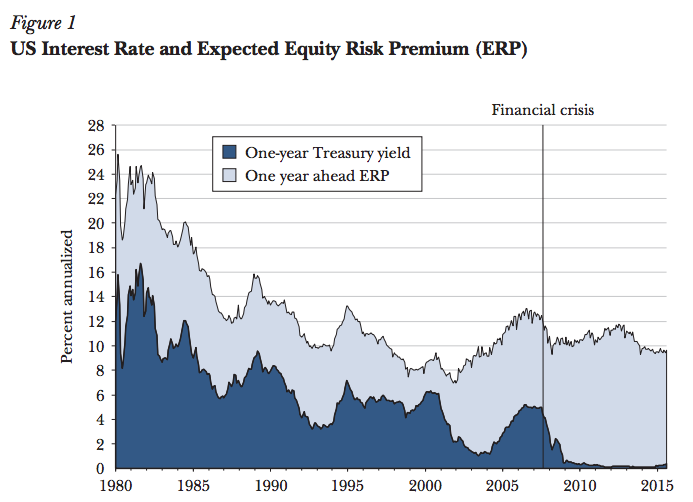 The chart above shows the most direct implications of the tightened supply. The bottom line shaded in by the dark area shows the steady decline in the short-term interest rate on safe assets going back to 1980. The top line is the expected return on equity, and the difference between the two (the light blue area) is the equity risk premium — the higher return that investors could get if they bought stocks.