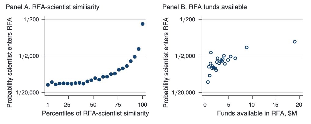 It turns out that offering funds to steer scientists toward new research agendas is expensive. Panel B looks at how much more likely researchers were to apply to an RFA when more funding was made available. Scientists respond to funding levels, but compared to the importance of similarity, funding plays a much smaller role in their decisions.