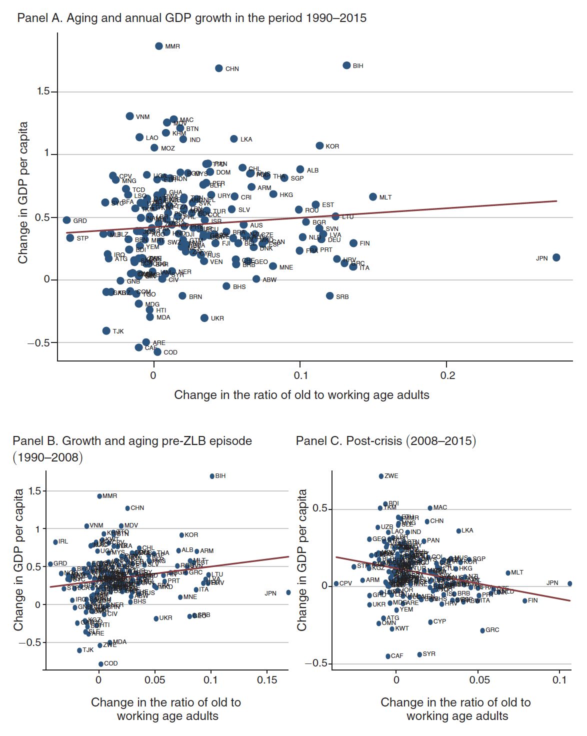 Figure 1 from their paper shows how the relationship between GDP per capita and the ratio of old to working age adults changes when broken out by the pre- and post-crisis periods. Each point represents a country, and red lines are lines of best fit.